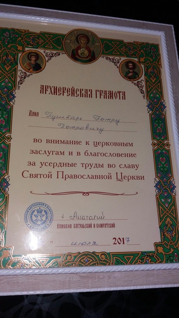 По завершению литургии епископ Кагульский и Комратский вручил ряду деятелей благодарственные письма за вклад в продвижение православия. В их числе был и председатель района Петр Пушкарь.