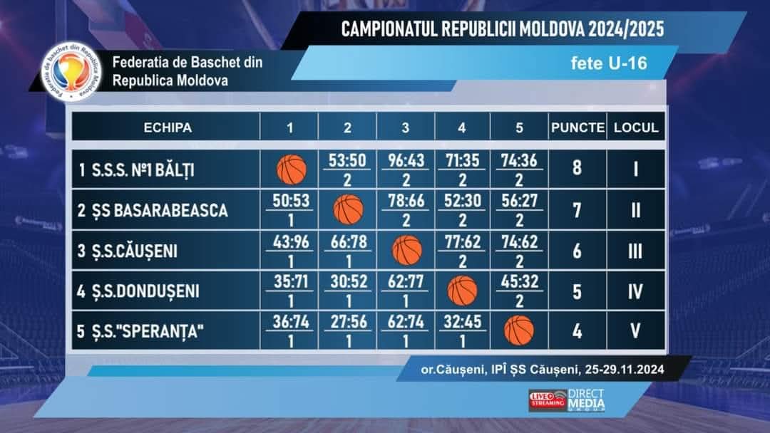 În perioada 25-29.11.2024, în or. Căușeni echipa Școlii Sportive raionale Basarabeasca de baschet, sub conducerea antrenorului, Croitoru Vitalie, a participat la Campionatul R. Moldova de baschet, U-16 (fete), au participat 5 echipe din Republica Moldova, și anume: